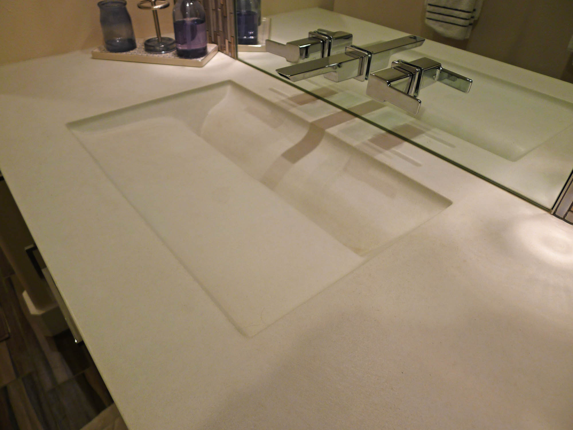 The ‘rincon’ sink is a petite wave style sink with a slot drain. Seen here cast in ‘bone’ white concrete. This bathroom remodel also features a concrete shower bench.
