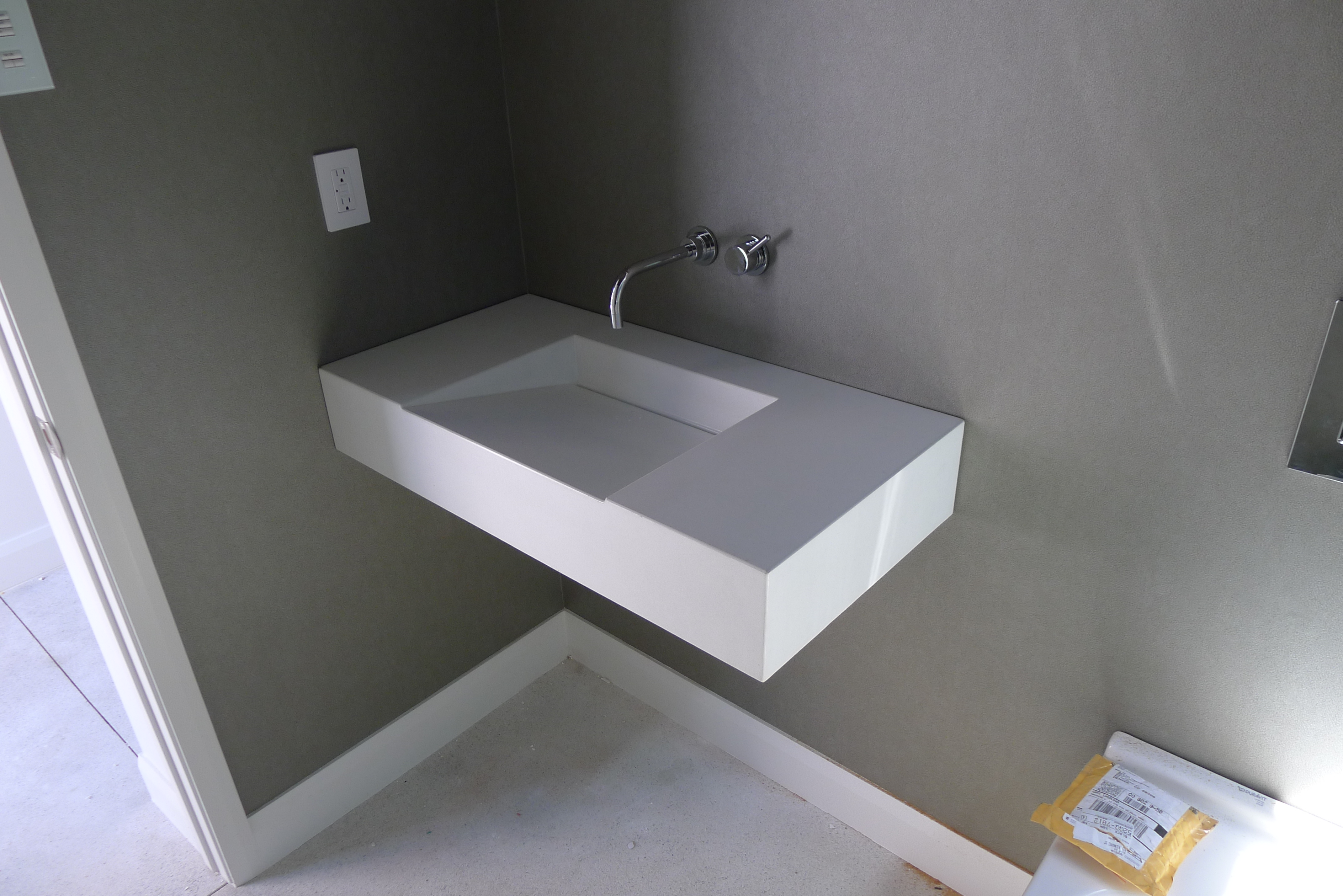 The pool house at Circle drive in Denver got a shallow wedge sink cast in ‘bone’ white concrete. To keep the bathroom clean and uncluttered there is no cabinet, the sink simply floats off the wall.