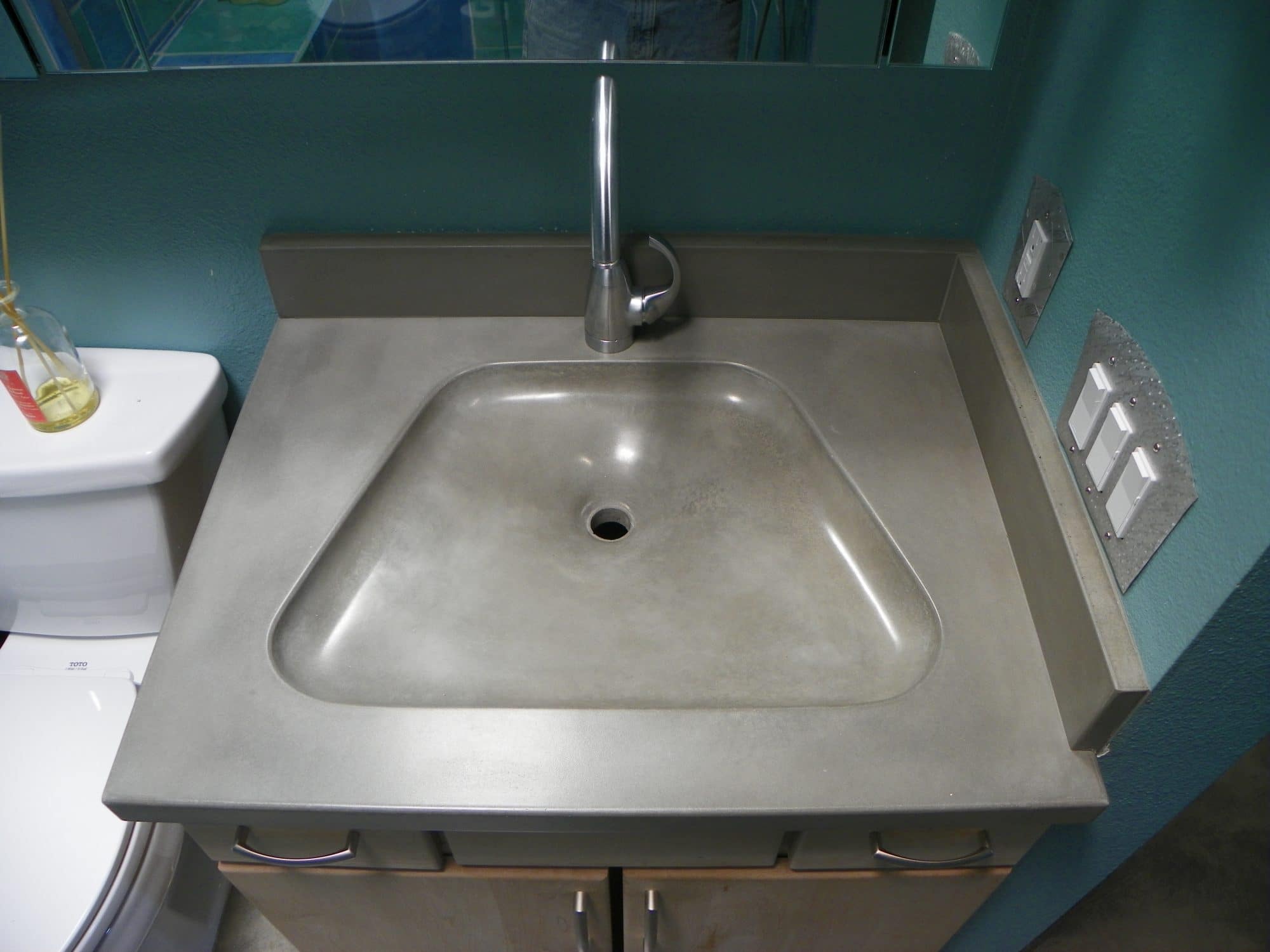 The unique curved shape of this sink was created with a custom fiberglass and fabric sink mold.