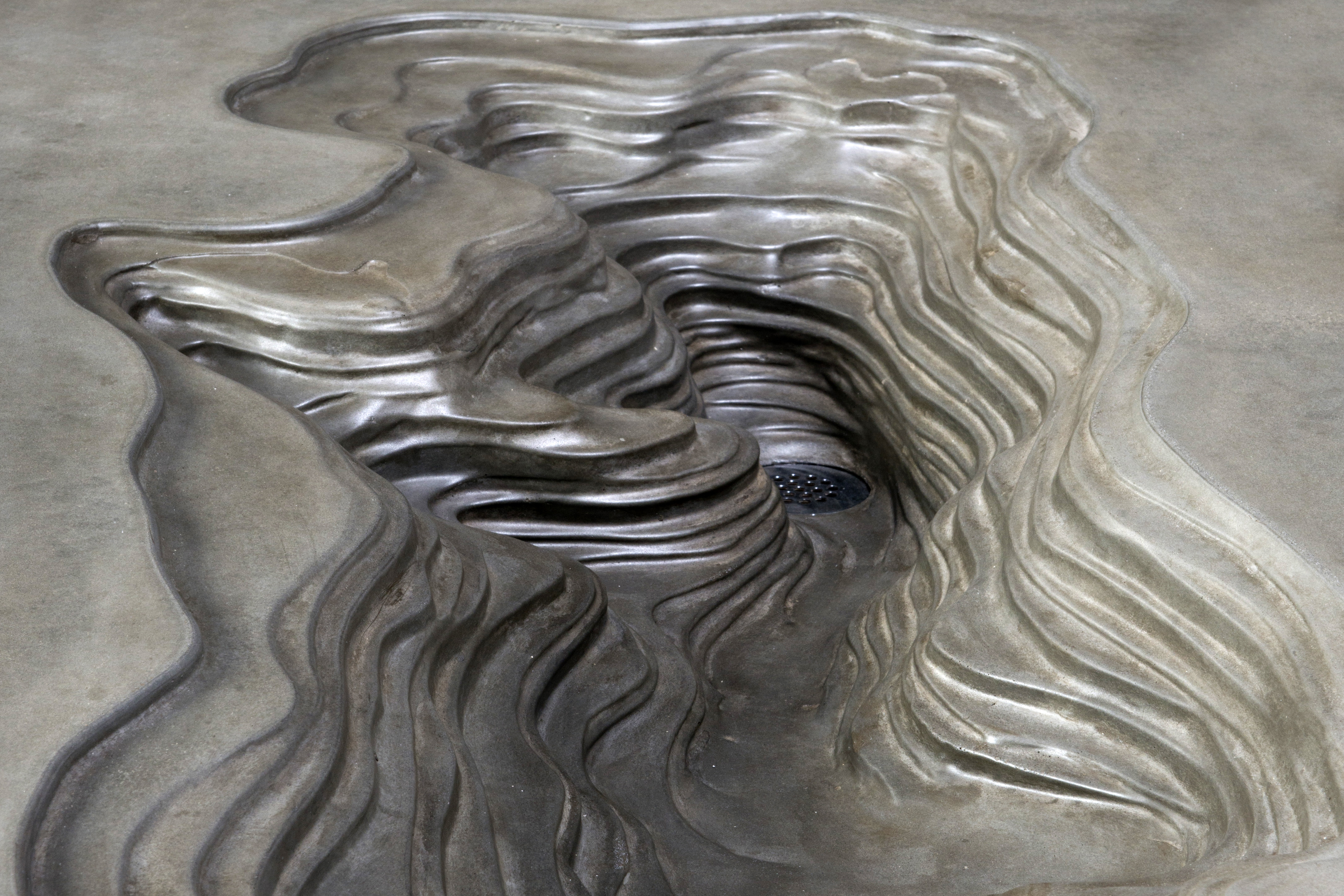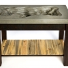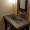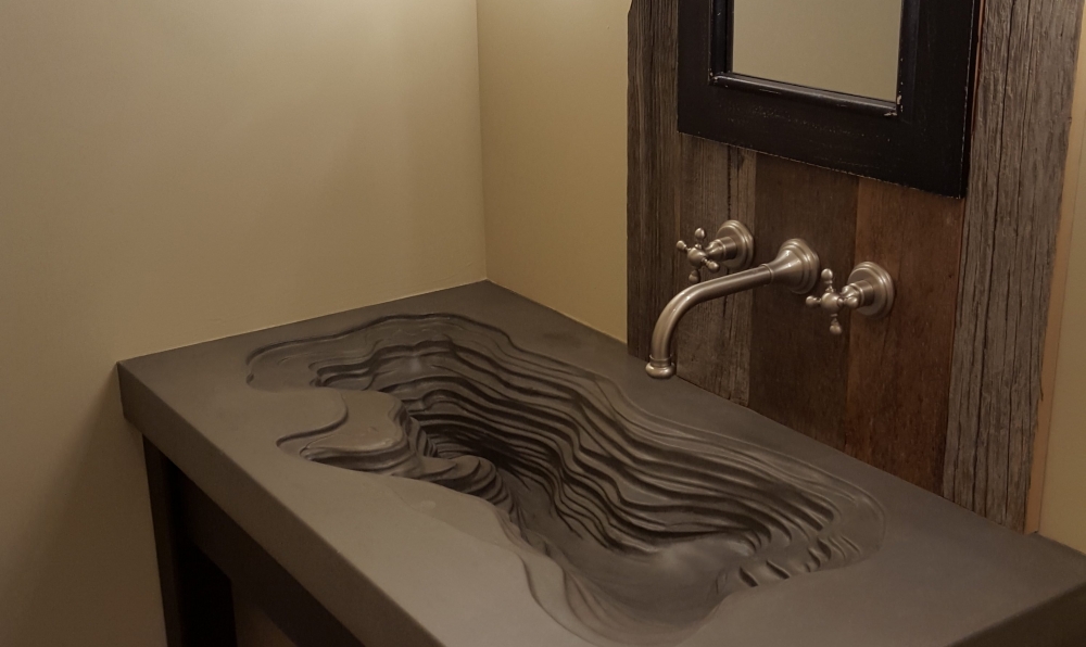 Colorado mountain modern.  Custom natural grey topographic sink.  Welded steel base with ‘japanese brown’ metal patina finish.  Lower shelf is local Colorado blue stain beetle kill pine.